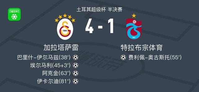 北京时间1月6日,土耳其超级杯半决赛展开较量,加拉塔萨雷与特拉布宗体育展开对决。比赛中,罗兰-绍洛伊送出助攻,巴里什-伊尔马兹接球后完成破门,为球队先拔头筹。随后,伊卡尔迪精准传球找到埃尔马利,后者成功扩大比分。上半场结束前,特拉布宗体育由费利佩-奥古斯托接奥莱贝助攻攻入一球,缩小分差。下半场,萨内送出关键传球,阿克金把握机会建功。比赛尾声阶段,卡拉塔什助攻伊卡尔迪破门,锁定胜局。最终,加拉塔萨雷以4比1战胜特拉布宗体育,顺利晋级下一轮。