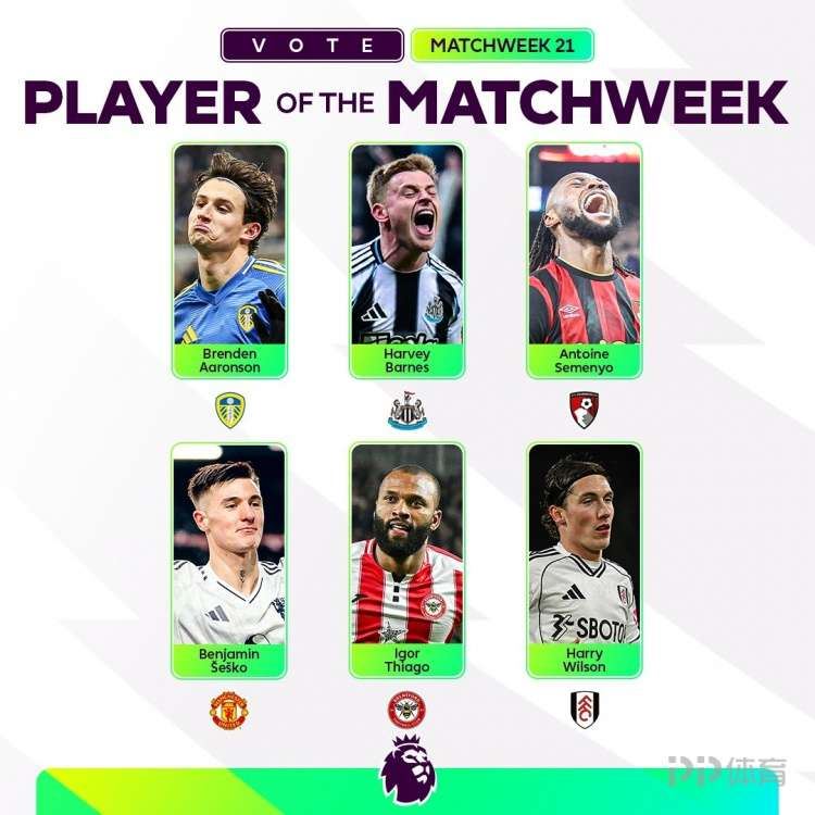 英超官方公布了第21轮比赛最佳球员候选,塞梅尼奥、谢什科在列。