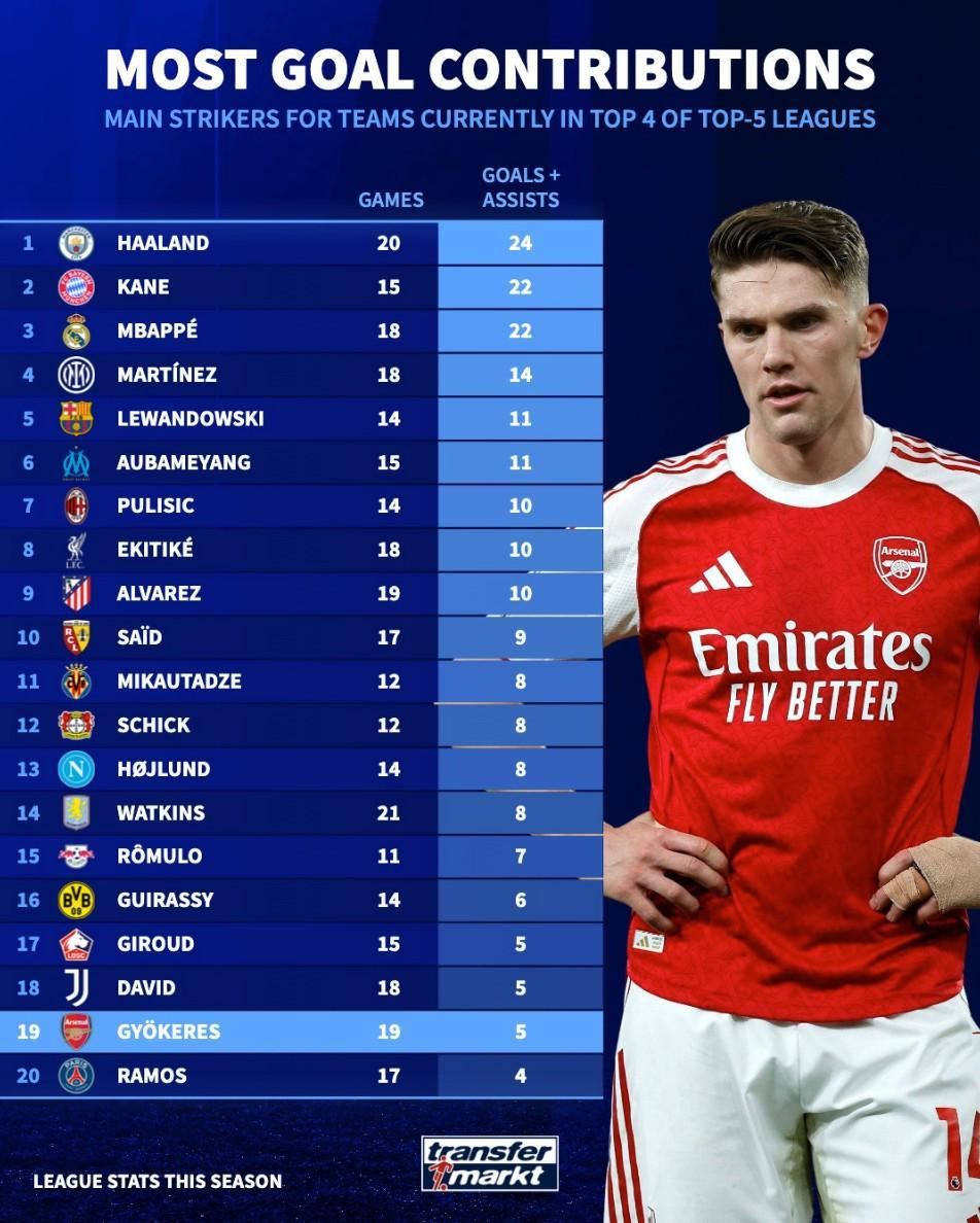 北京时间1月9日,德转统计出了目前欧洲五大联赛排名前四的球队中各自队内第一前锋的直接参与进球数排行榜,曼城的哈兰德以24球排名第一,而阿森纳的哲凯赖什则以5球排名倒数第二。