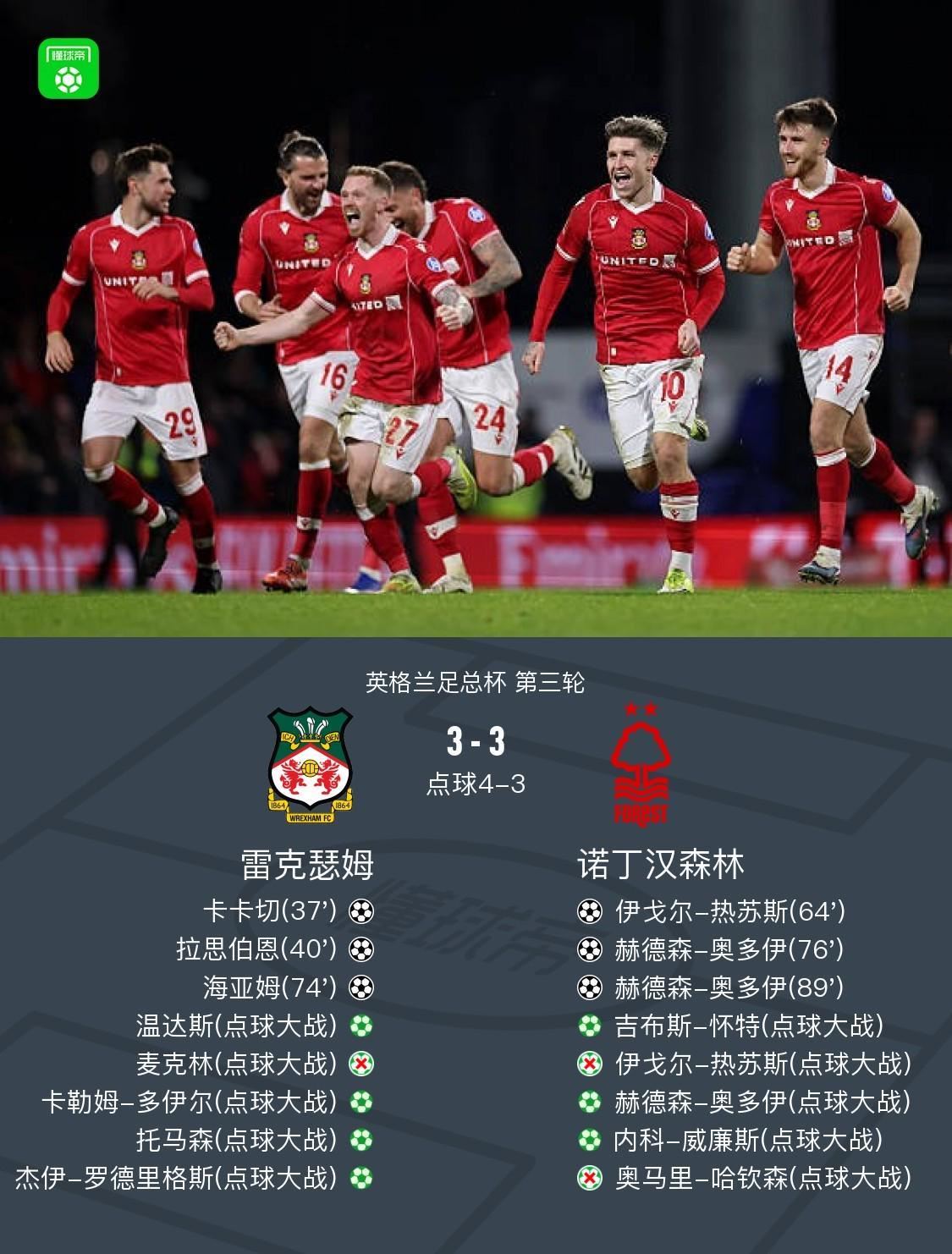 北京时间1月10日英格兰足总杯 第三轮,雷克瑟姆对阵诺丁汉森林。上半场,卡卡切和拉思伯恩相继为主队破门。下半场,热苏斯扳回一城。海亚姆冲顶得分,不过奥多伊连下两城帮助森林扳平比分,两队进入加时赛。加时赛中,两只球队均无建树,双方进入点球大战。点球大战中,伊戈尔-热苏斯和哈钦森相继失点,森林总分6-7不敌雷克瑟姆,被对手淘汰出足总杯。