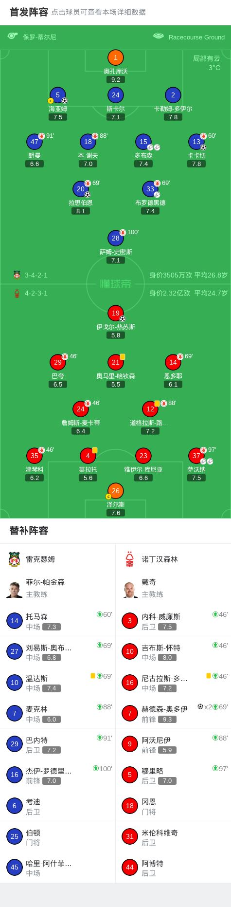 第76分钟,多布森开出任意球,海亚姆冲顶得分,雷克瑟姆3-1