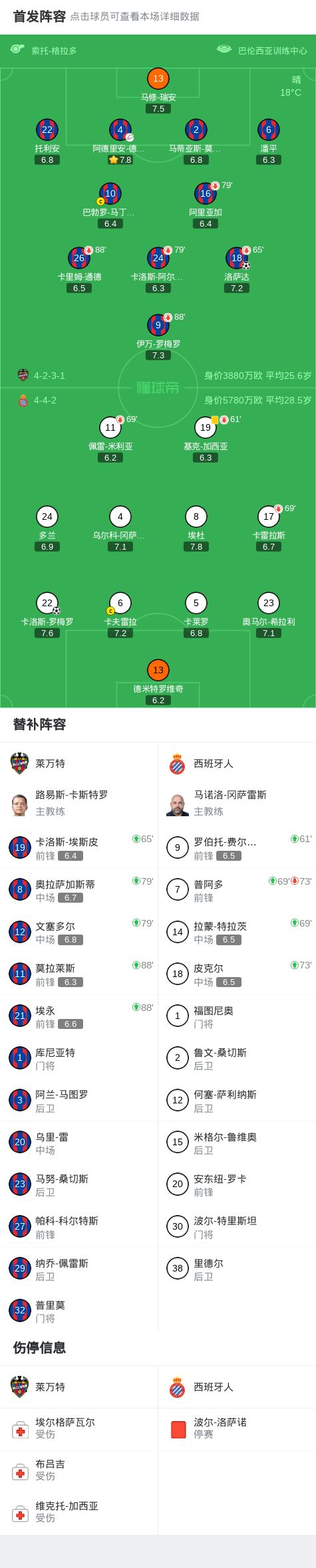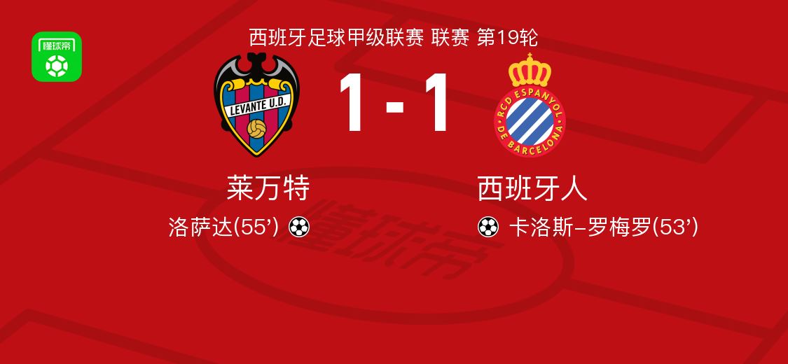 北京时间1月11日西班牙足球甲级联赛 联赛 第19轮,莱万特主场对阵西班牙人。莱万特洛萨达破门。西班牙人卡洛斯-罗梅罗破门。最终比分莱万特 1-1 西班牙人。