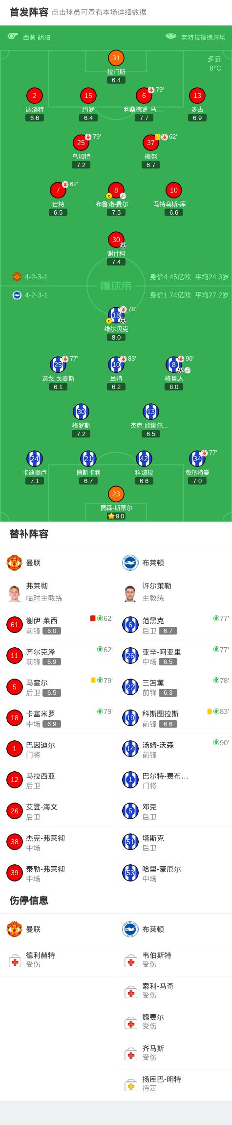 第85分钟,B费角球开出,谢什科头球破门,曼联1-2布莱顿