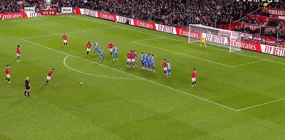 第42分钟,B费任意球贴地斩,皮球偏出球门