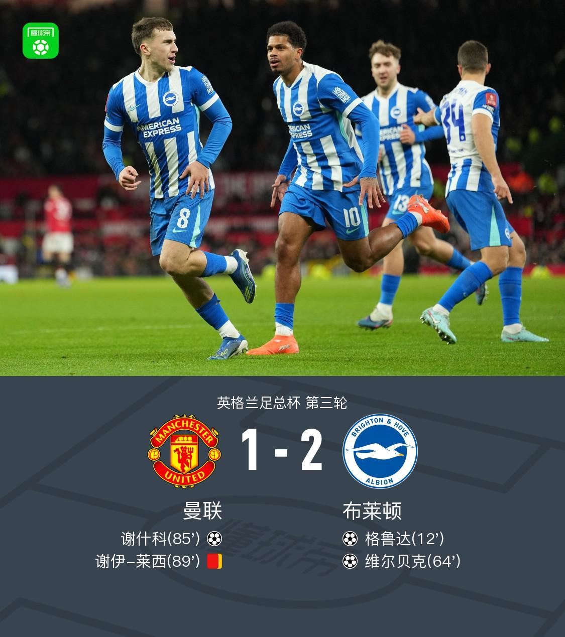 北京时间1月12日英格兰足总杯 第三轮,曼联对阵布莱顿。曼联谢什科破门。布莱顿格鲁达破门,维尔贝克破门。最终比分曼联 1-2 布莱顿。