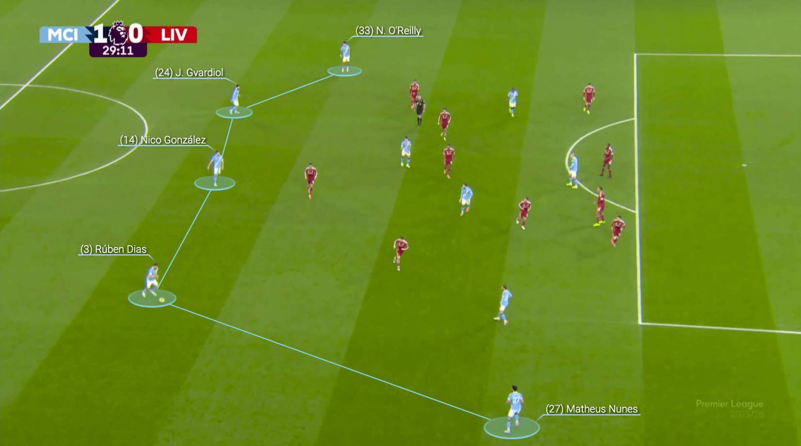 控球从曼城半场深处开始,奥赖利被萨拉赫逼入角落,接着福登及时赶到,接到奥赖利的传球,躲过3次抢断后将球传给尼科-冈萨雷斯。