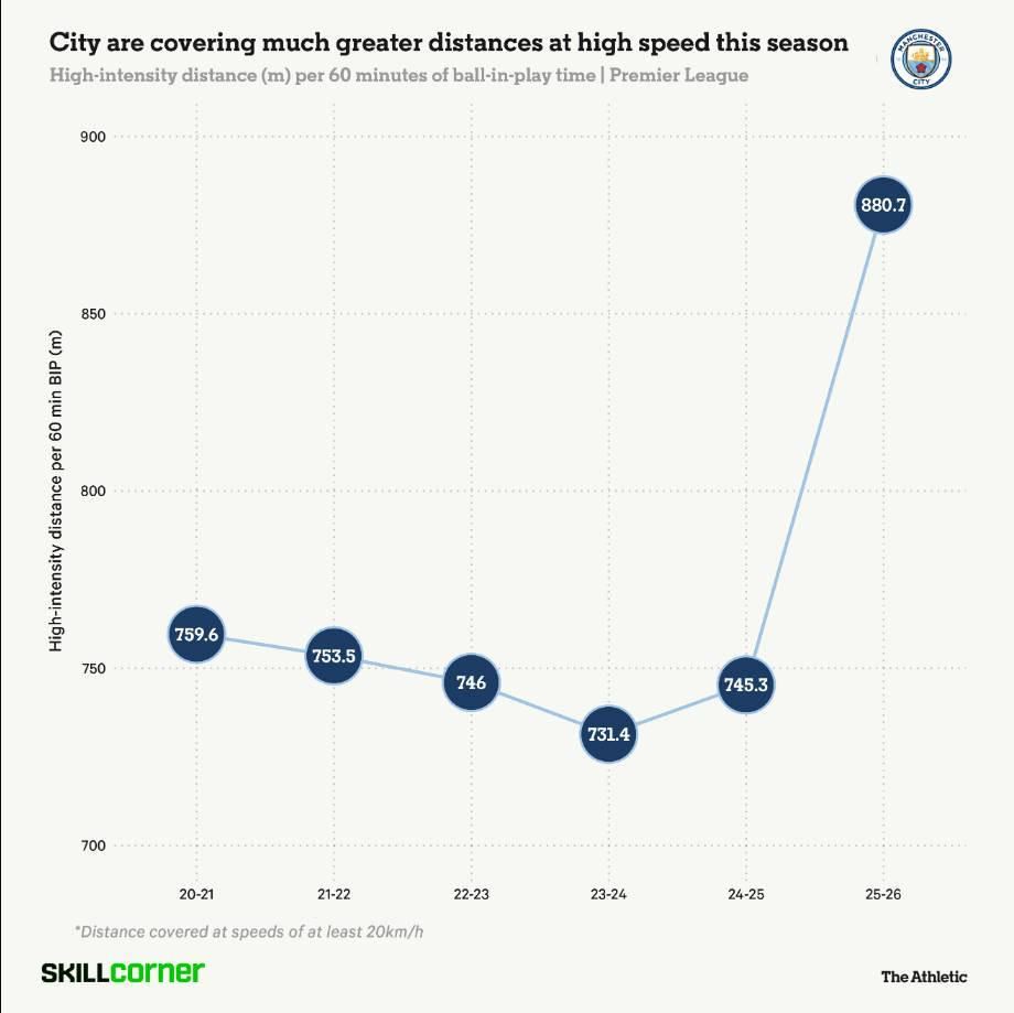 根据SkillCorner的追踪数据,曼城每60分钟的高强度跑动距离(以20公里/小时或更高速度跑动)增加了约18.2%,这给核心球员群体带来了额外的体能负担。