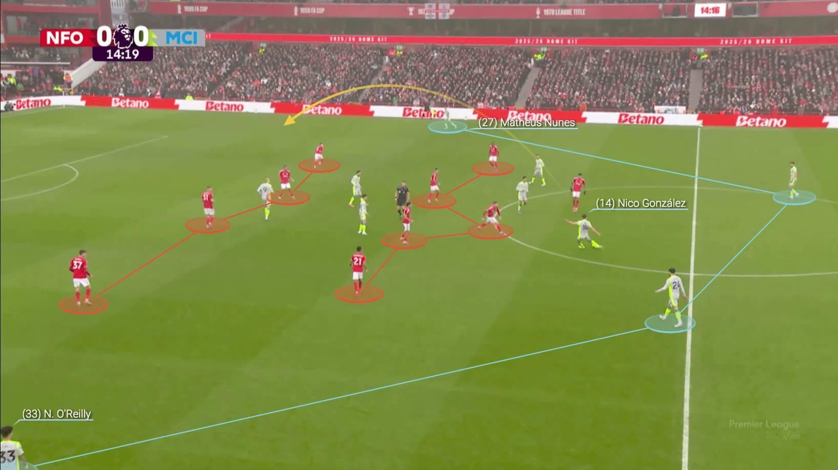 对阵诺丁汉森林时,曼城乐于通过直接的对角传球找到边后卫,利用宽度来绕过对方的4-5-1阵型。