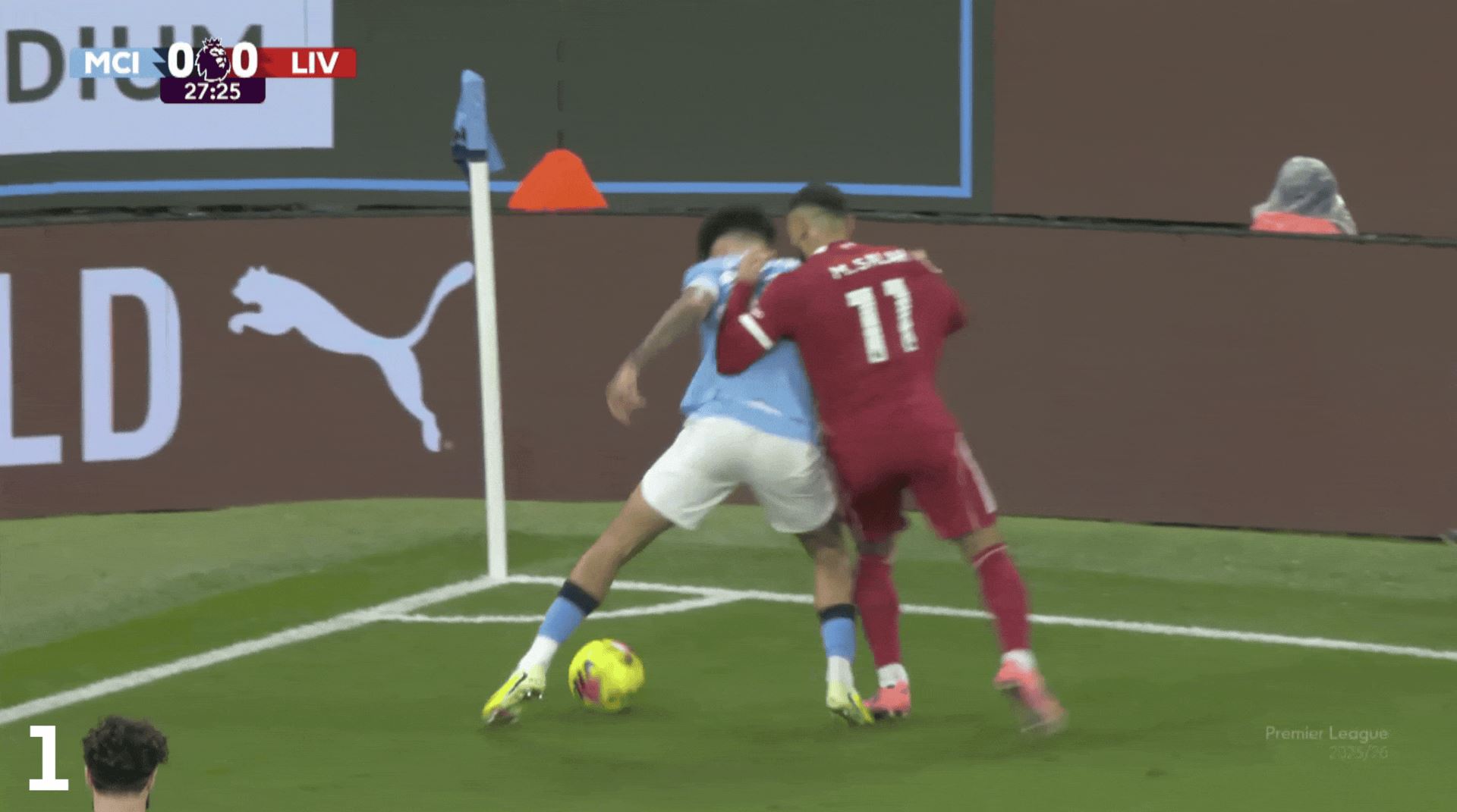 控球从曼城半场深处开始,奥赖利被萨拉赫逼入角落,接着福登及时赶到,接到奥赖利的传球,躲过3次抢断后将球传给尼科-冈萨雷斯。