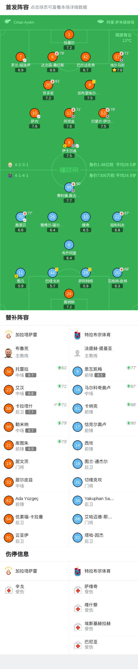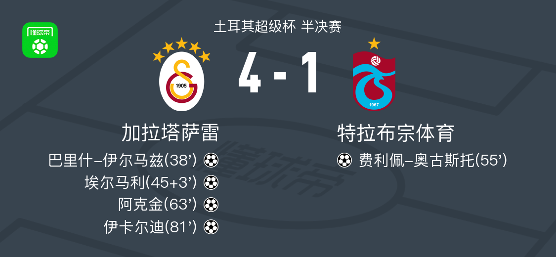北京时间1月6日,土耳其超级杯半决赛展开较量,加拉塔萨雷与特拉布宗体育展开对决。比赛中,加拉塔萨雷率先打破僵局,巴里什-伊尔马兹接罗兰-绍洛伊的助攻成功破门。随后,伊卡尔迪送出精准传球,帮助埃尔马利再下一城。上半场临近结束之际,加拉塔萨雷扩大领先优势,萨内助攻阿克金完成进球。下半场开始后,特拉布宗体育由费利佩-奥古斯托接奥莱贝的助攻扳回一球。比赛进入尾声阶段,加拉塔萨雷再度发力,卡拉塔什助攻伊卡尔迪破门锁定胜局。最终,加拉塔萨雷以4比1战胜特拉布宗体育,顺利晋级下一轮。