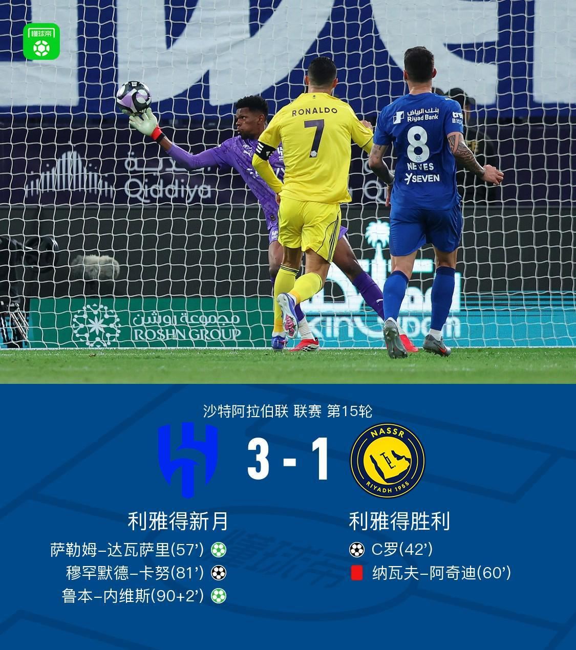 第90分钟,达瓦萨里造点,鲁本-内维斯点射命中,利雅得新月3-1锁定胜局