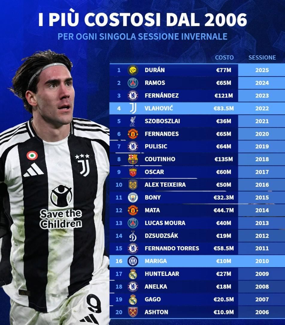 德转列2006年至2025年全球冬窗标王: