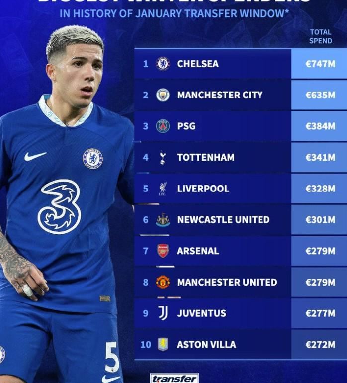 冬窗开启已经有一段时间了,德转也统计了历史冬窗各个俱乐部的累计支出,切尔西以7.47亿欧元支出排名榜首,前十名中英超俱乐部占据了八席。