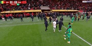 当时双方战成0-0,塞内加尔一粒进球被判无效,随后裁判判给摩洛哥一粒点球。对这一判罚感到强烈不满的塞内加尔球员一度集体离场,返回更衣室,比赛面临失控风险。