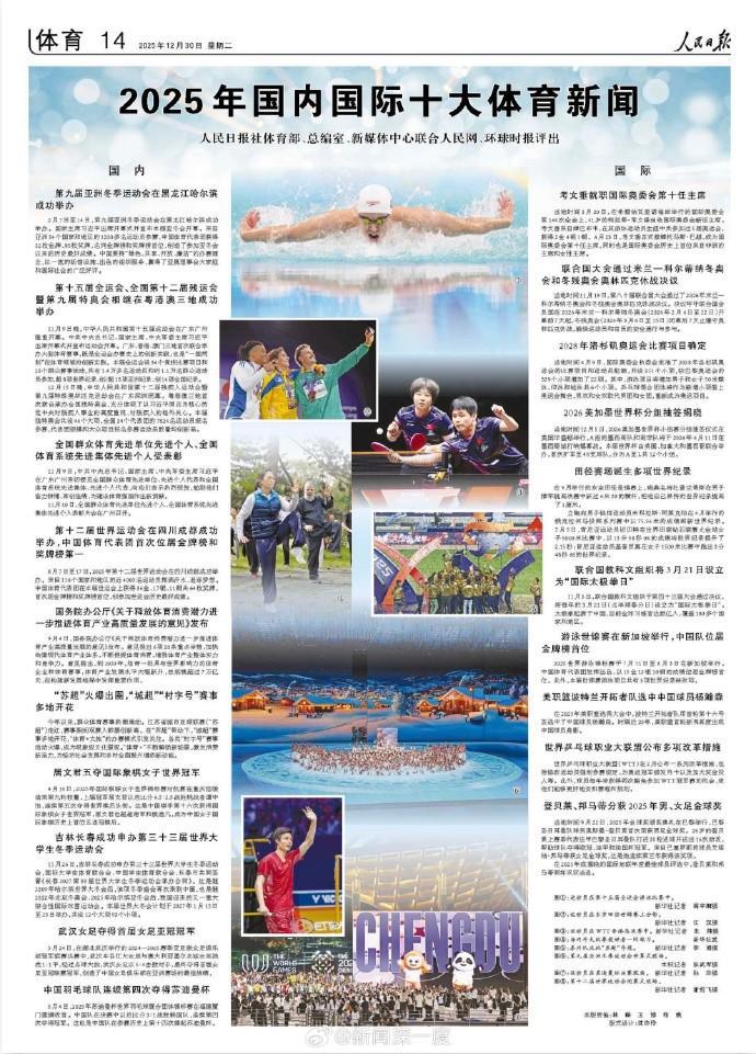 北京时间12月30日,人民日报刊发由人民日报社体育部、总编室、新媒体中心联合人民网 、环球时报评出的“2025年国内国际十大体育新闻”。