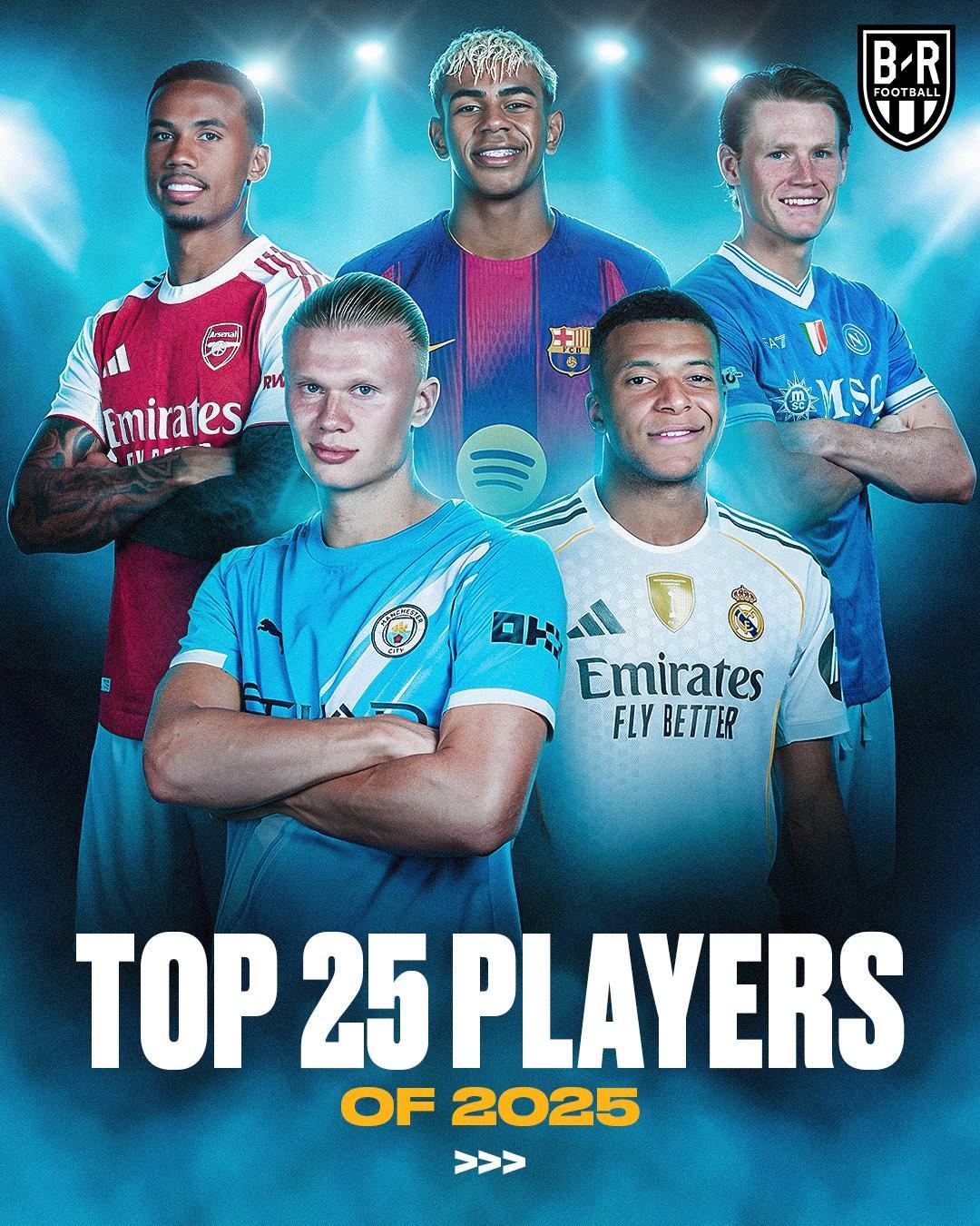 2025年年底,B/R Football评选了2025自然年里的25大球星,登贝莱居首,姆巴佩、凯恩分列2-3位,亚马尔排名第7。