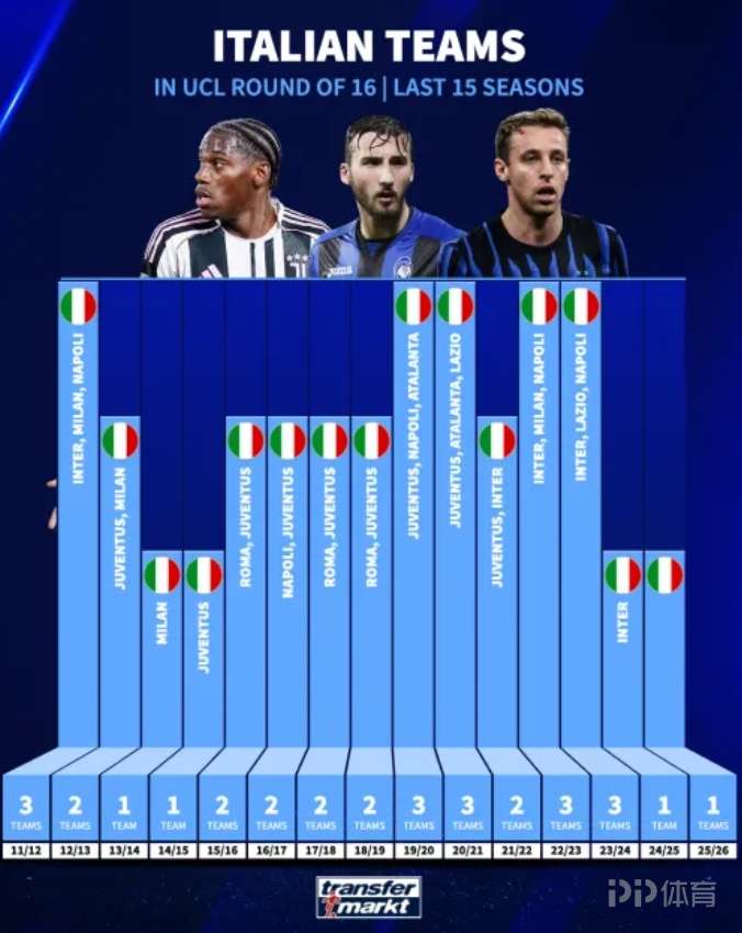 德转盘点过去15个赛季意甲球队进入欧冠淘汰赛的数量