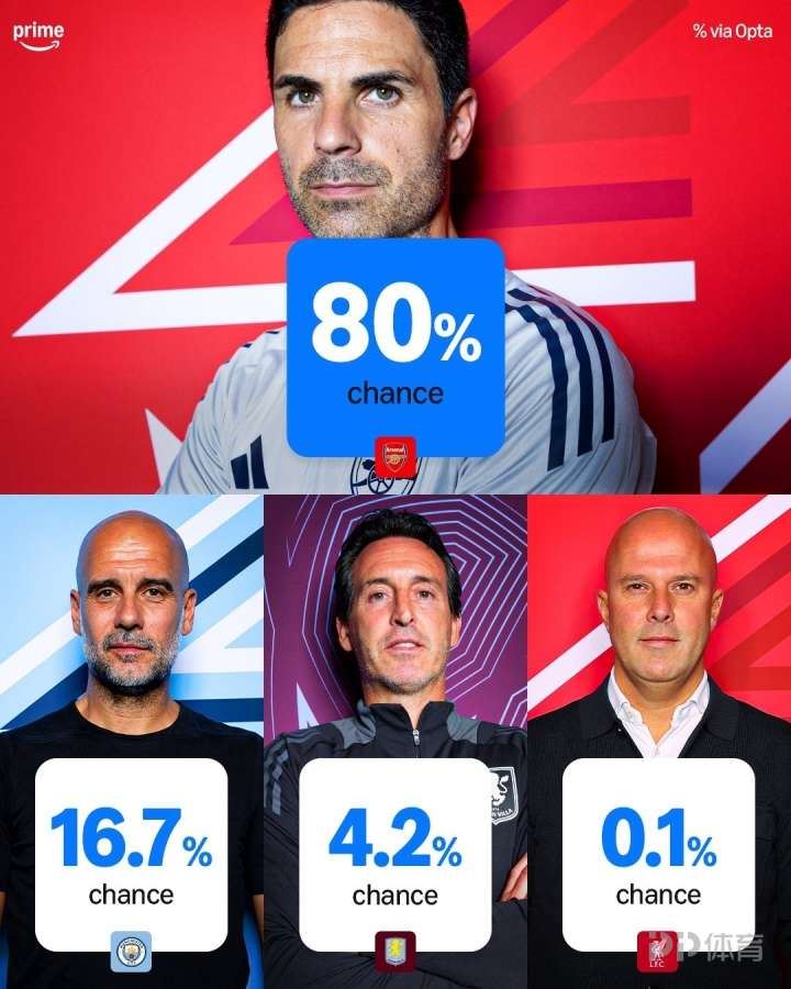 英超赛季已经过半,数据机构OPTA计算了最新的英超夺冠概率,阿森纳以80%的夺冠概率遥遥领先,曼城夺冠概率为16.7%,阿斯顿维拉4.2%,利物浦0.1%。
